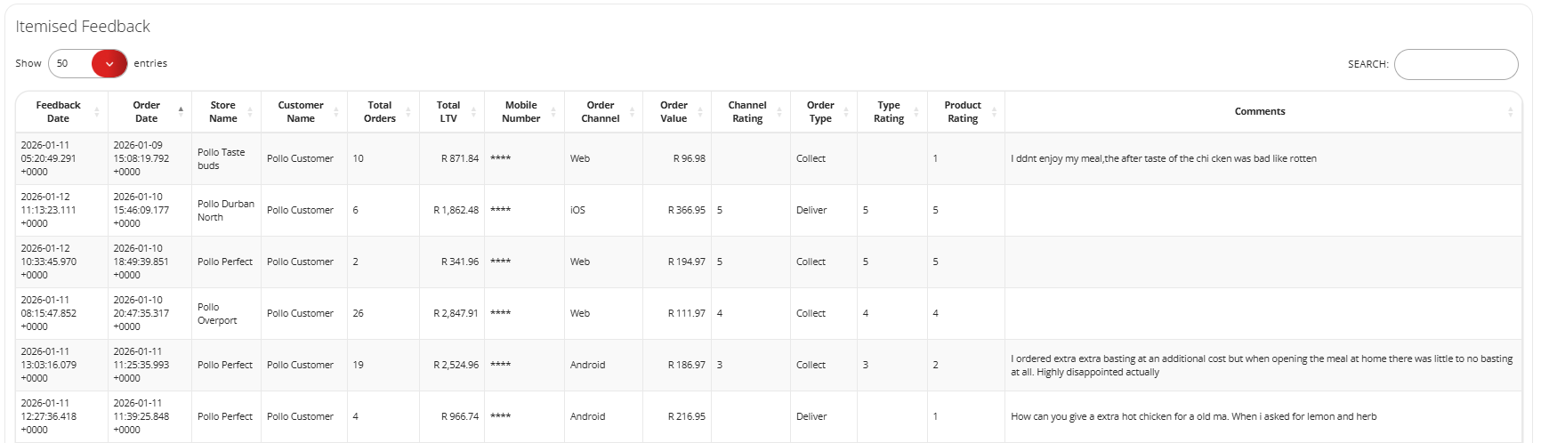 This column displays any comments or feedback from customers, that they have entered regarding any aspect of their experience.