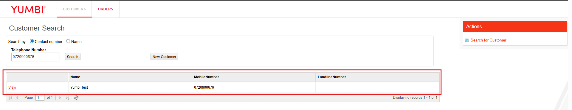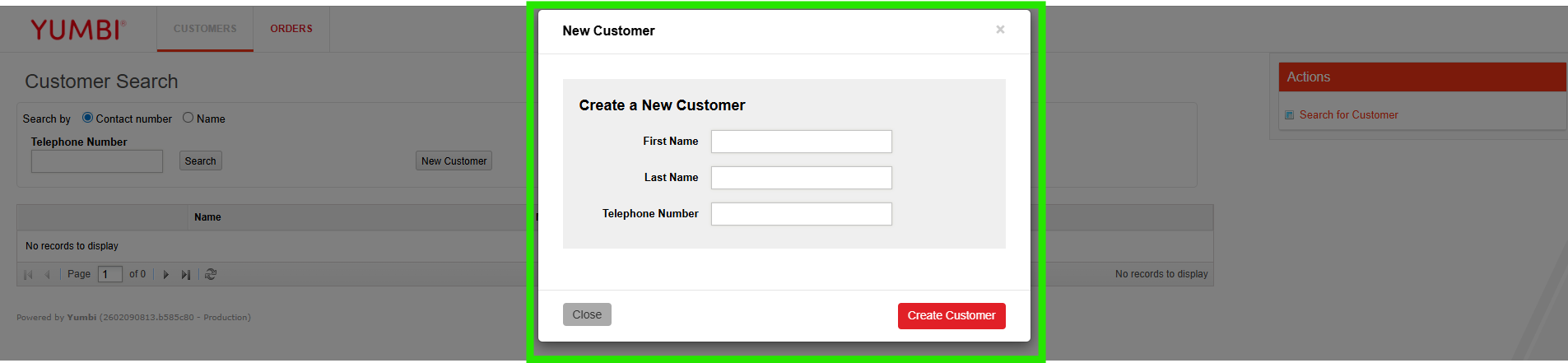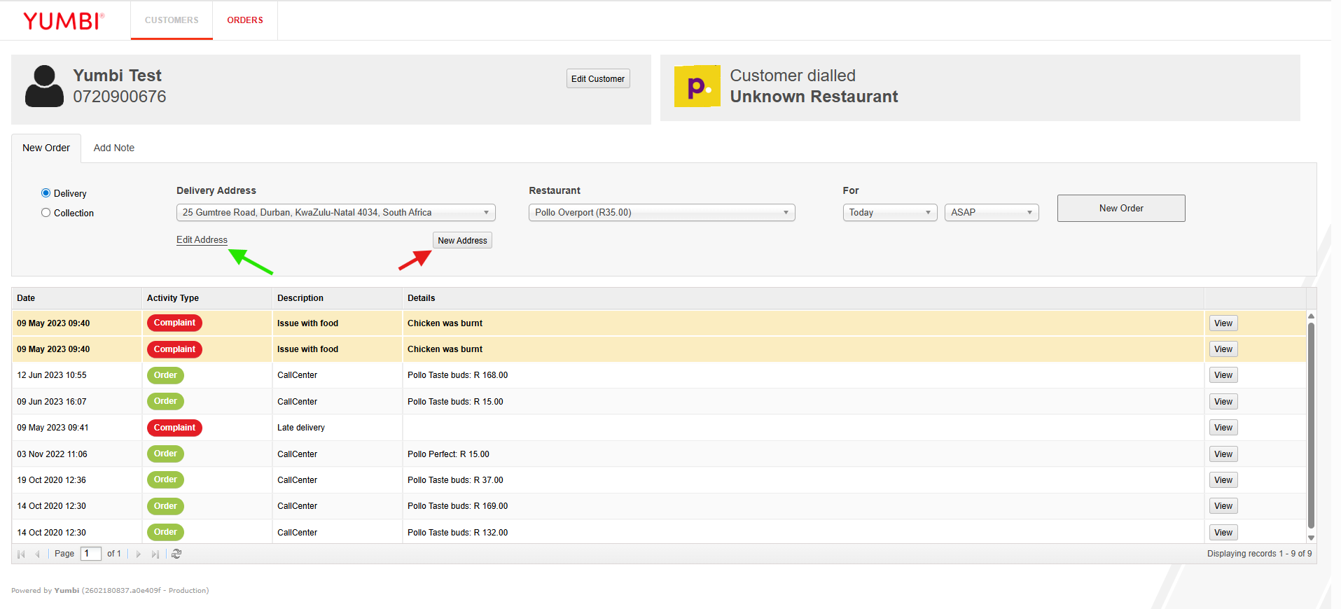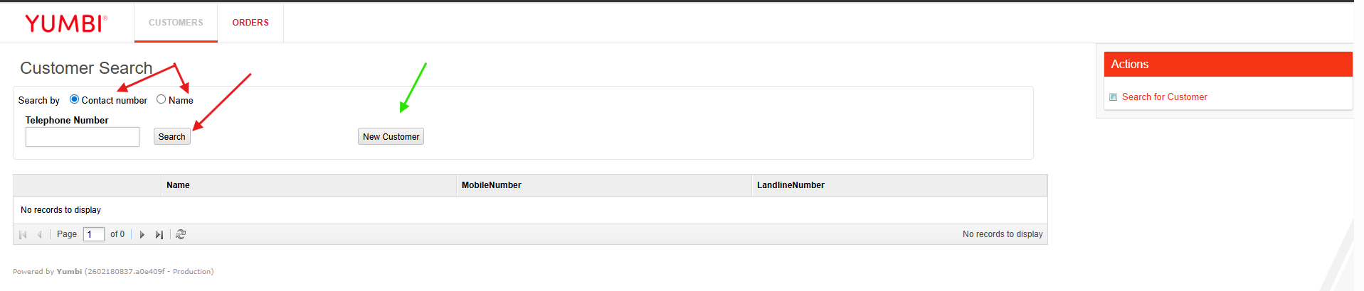 To initiate an order, an Agent must first access the customer's details they intend to serve. The Agent must either search for an existing customer by the customer's contact or name in the search bar (see red arrows on Figure 1) or create a new customer (see green arrow on Figure 1).