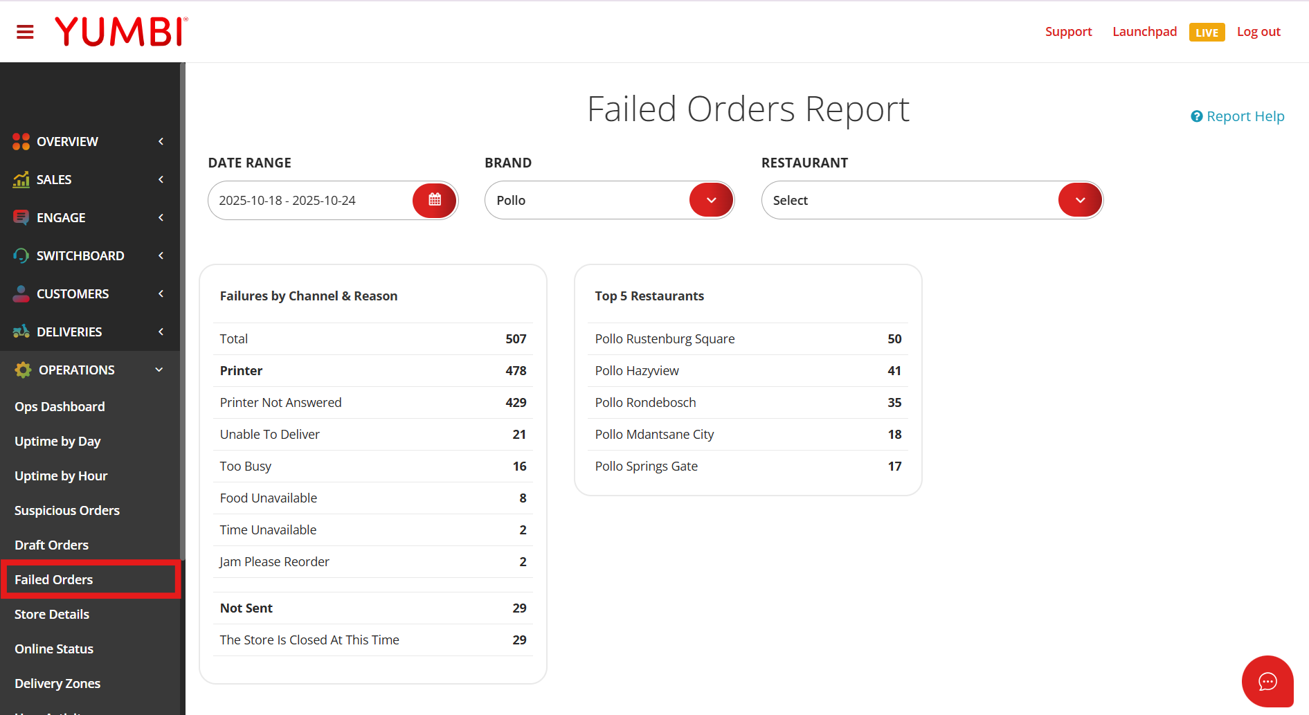 The Operations Dashboard report delivers comprehensive insights into the performance of restaurants on the YUMBI platform, covering aspects such as overall performance, uptime, and engagement. For those restaurants offering delivery services, it ...